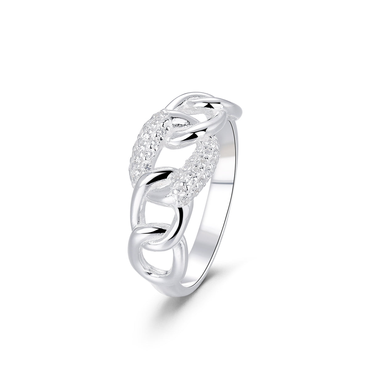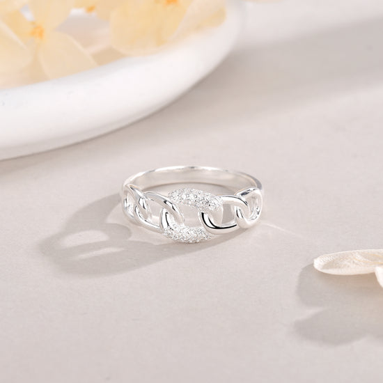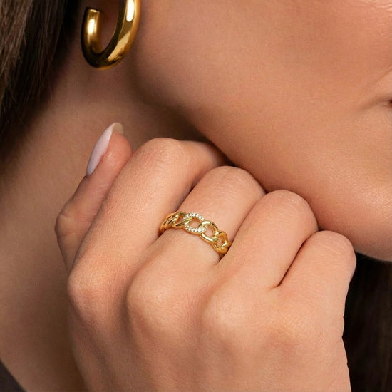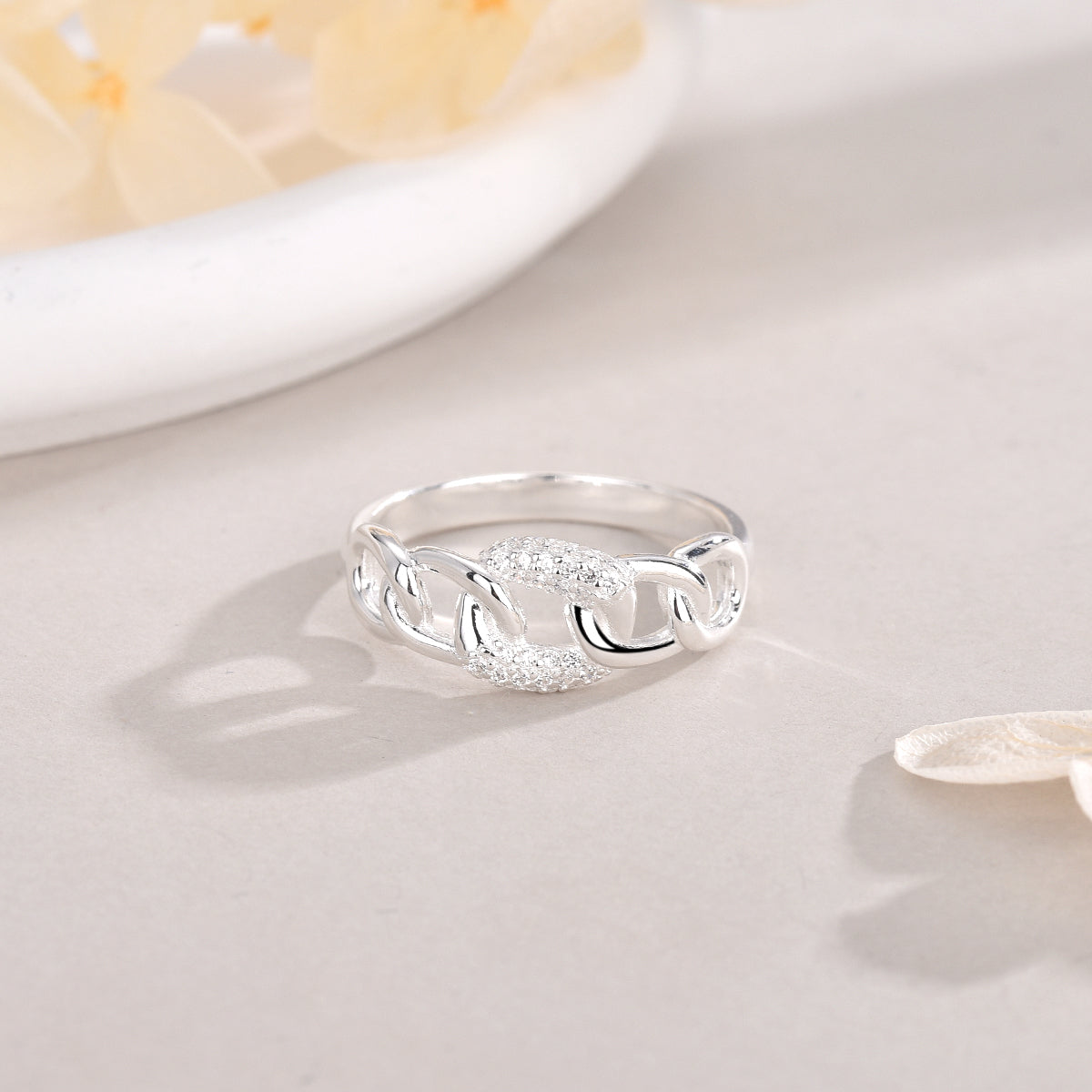 El Anillo Eslabones Sparkle plata combina eslabones suaves y femeninos con un toque de circonitas que ilumina cada movimiento. Su diseño moderno, elegante y lleno de carácter lo convierte en la pieza perfecta para elevar tus looks del día a día. Un anillo de estilo cadena que aporta luz, tendencia y mucha personalidad. 💛