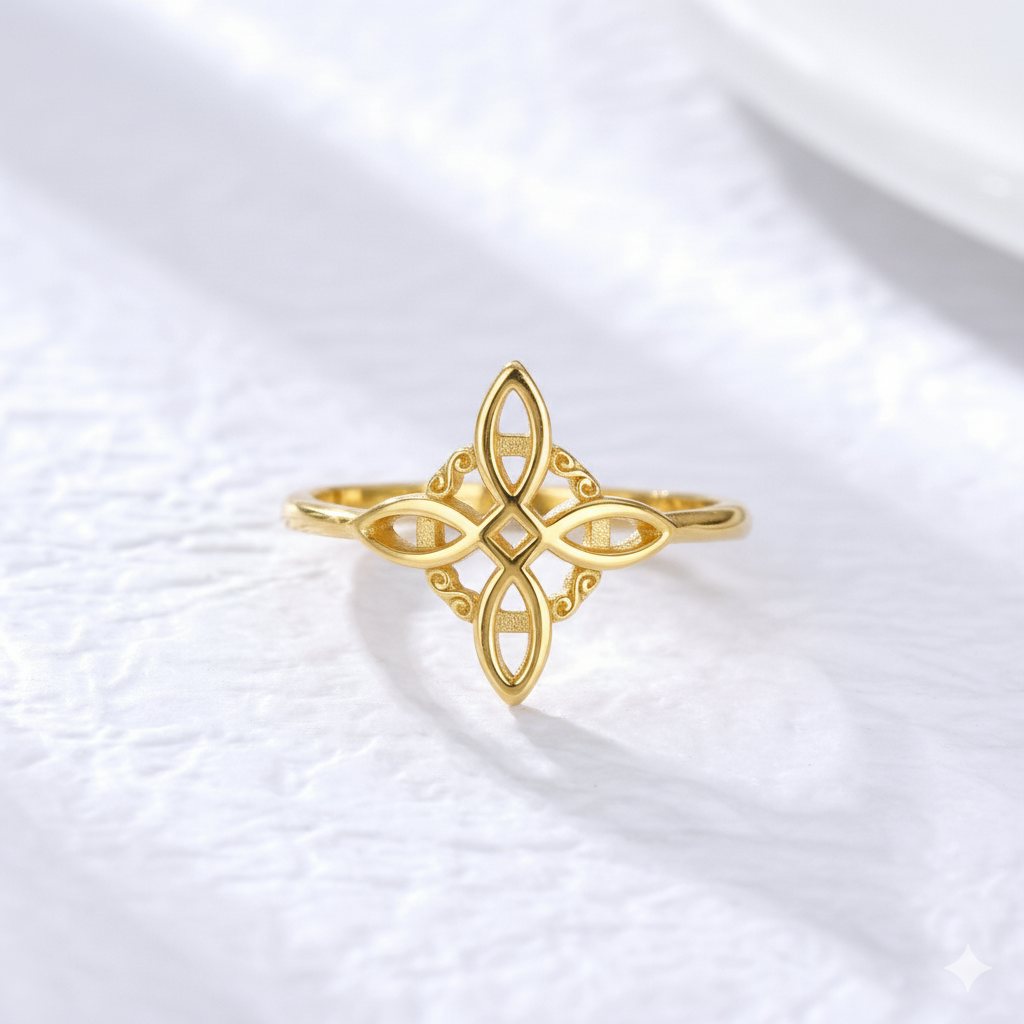 El Anillo Nudo de Bruja baño en oro de 18kt destaca por su diseño inspirado en los nudos mágicos, creando una forma delicada y especial que atrae miradas. Ideal para quienes buscan una joya con significado, elegante y perfecta para llevar a diario como amuleto personal o para combinar con otros anillos. 🤍