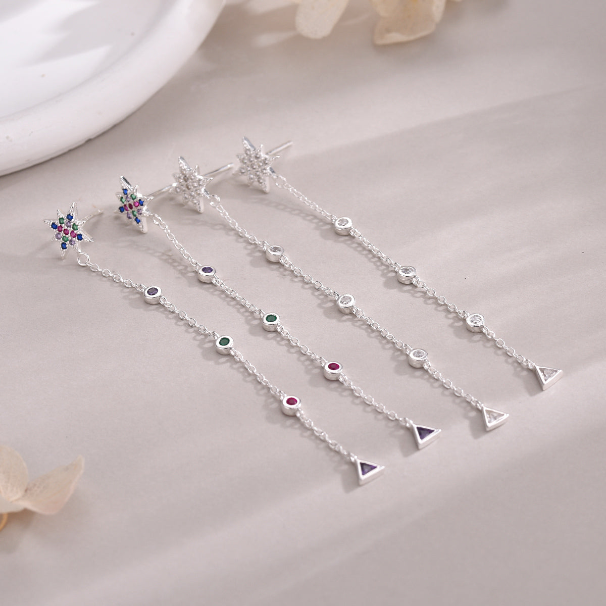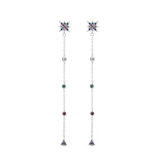 Los Pendientes largos Cosmic Drops plata combinan una estrella multicolor con una cadenita llena de mini destellos y un triángulo final que mueve la luz con cada paso. Largos, finos y súper especiales: justo ese pendiente que transforma un outfit sencillo en algo mágico. 💜🌈