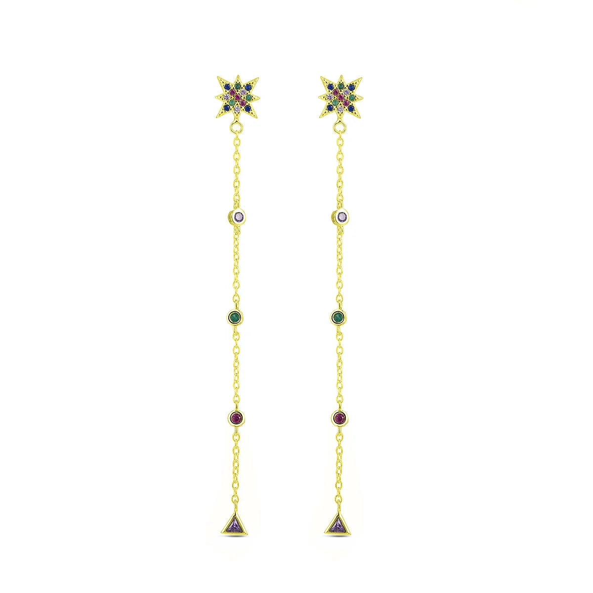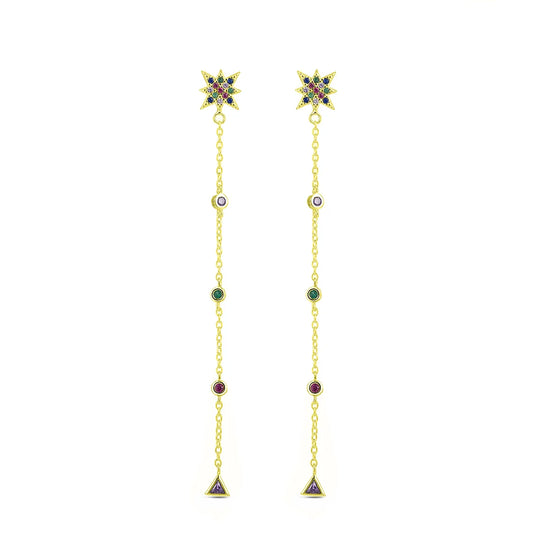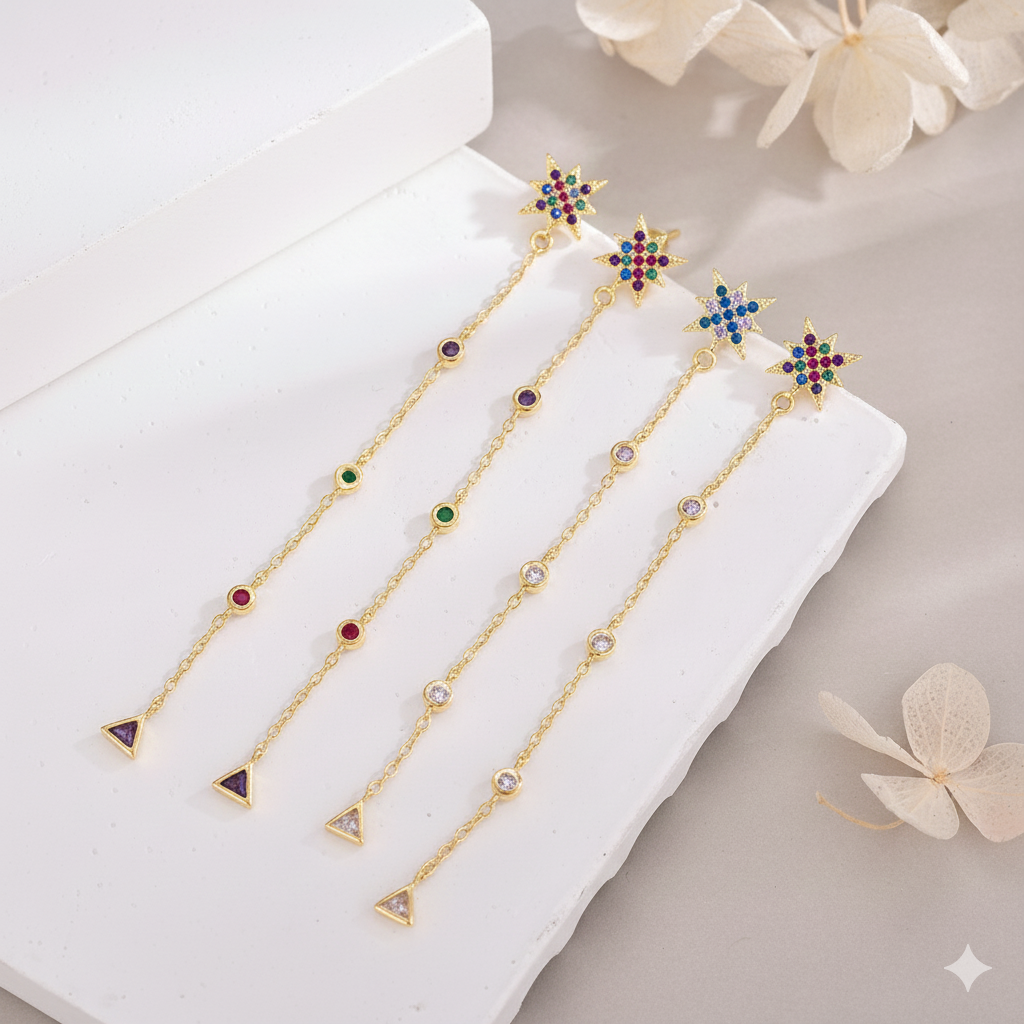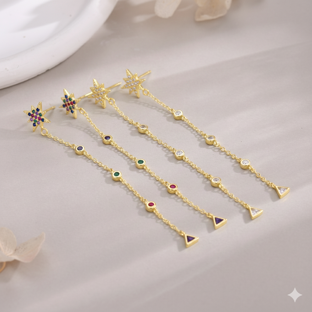 Los Pendientes largos Cosmic Drops plata baño en oro de 18kt combinan una estrella multicolor con una cadenita llena de mini destellos y un triángulo final que mueve la luz con cada paso. Largos, finos y súper especiales: justo ese pendiente que transforma un outfit sencillo en algo mágico. 💜🌈