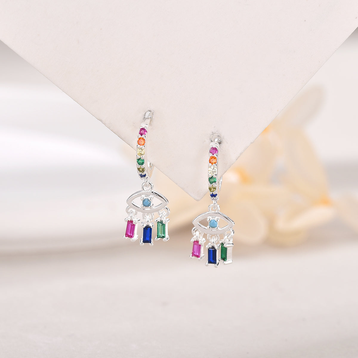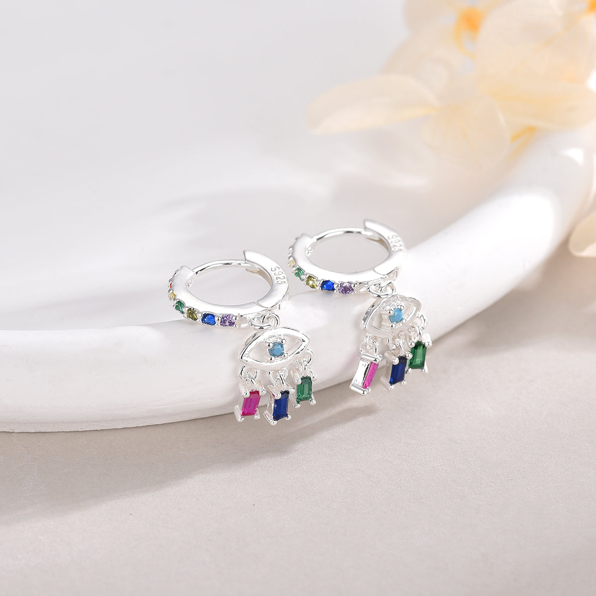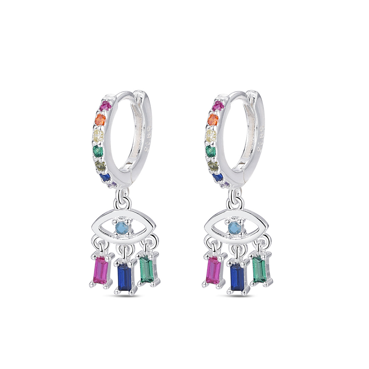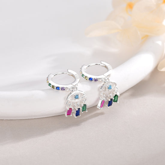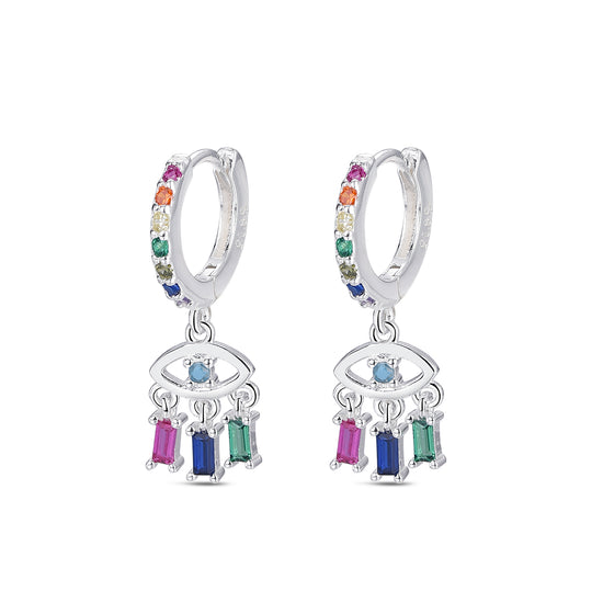 Los Pendientes Mystic Rainbow plata mezclan un aro lleno de circonitas multicolor con un charm de ojo y mini baguettes que se mueven con cada paso. Un diseño divertido y súper actual para dar luz y vibras bonitas a cualquier look. 🌈🤍