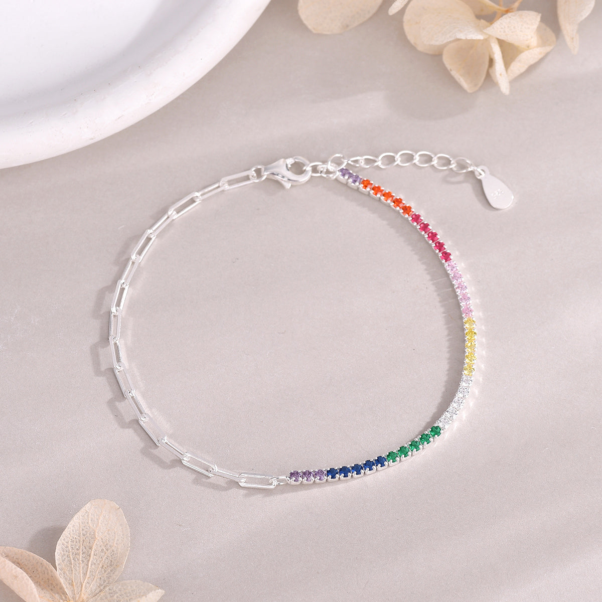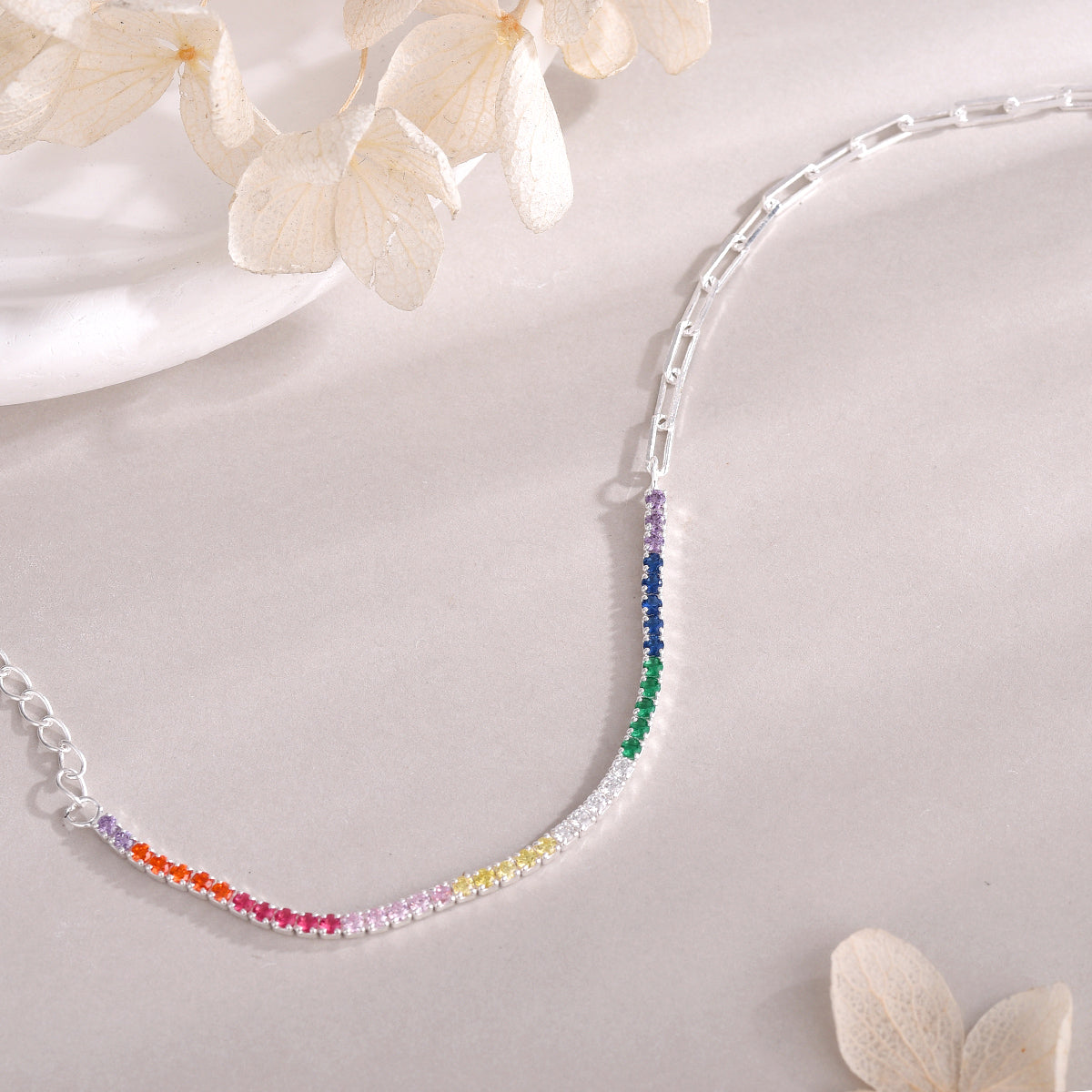 Minimal por un lado, pura explosión de color por el otro 🌈 La combinación entre cadena tipo paperclip y línea de circonitas crea un contraste moderno que no pasa desapercibido. Es ligera, diferente y perfecta si te gusta mezclar estilos sin complicarte 💛 Un diseño actual que transforma cualquier look básico en algo con intención.